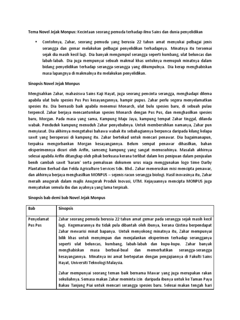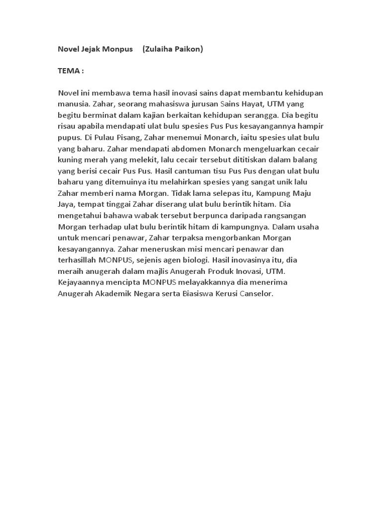 B anak tunggal dalam keluarga dan berumur 22 tahun. Muat turun halaman 1-8 di AnyFlip. Latar Masyarakat Novel Jejak MONPUS Masyarakat yang mementingkan Ilmu Pengetahuan Mementingkan Ilmu Pengetahuan Zahar sering melakukan penyelidikan eksperimen dan invoasi untuk kepentingan masyarakat umum.