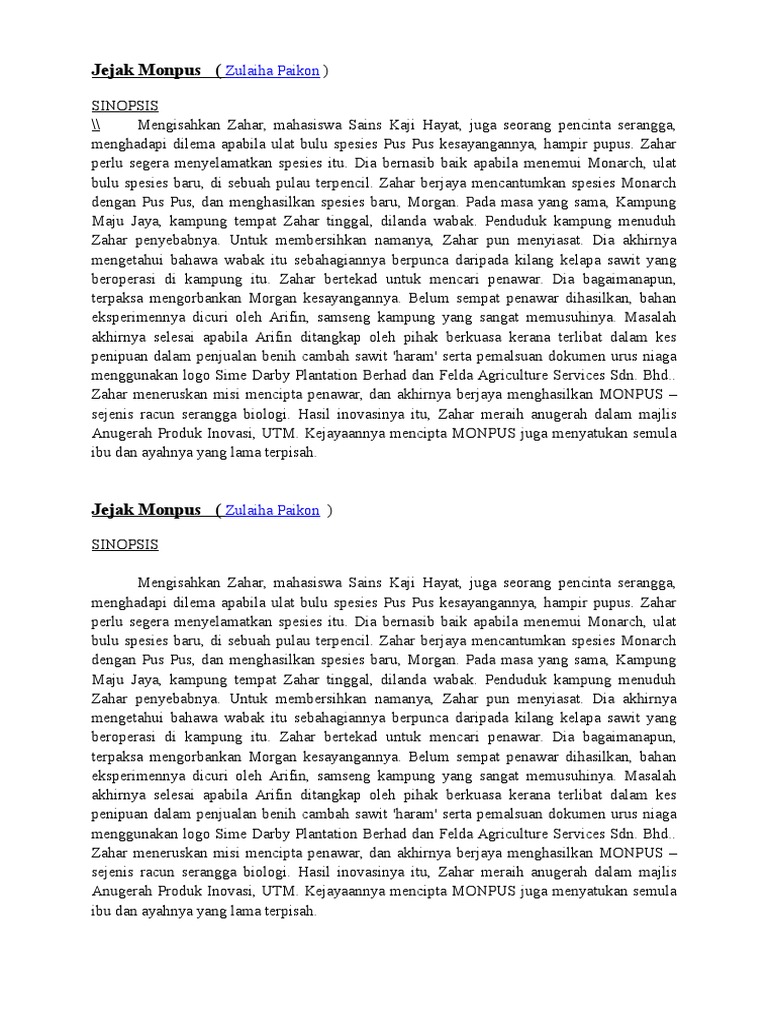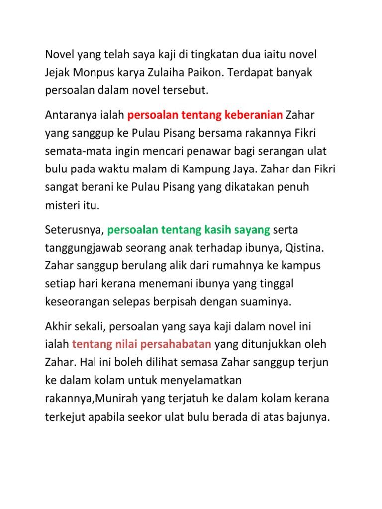 Novel jejak monpus mengisahkan watak zahar seorang penuntut jurusan biologi fakuti sains hayat. C Sekolah Menengah Kebangsaan Sri Yasin. Contoh Latar Masyarakat Novel Jejak Monpus - Persoalan latar masyarakat perwatakan nilai dan pengajaran watak utama Novel yang telah saya kaji dalam tingkatan 2 ialah Jejak Monpus karya Zulaiha Paikon.